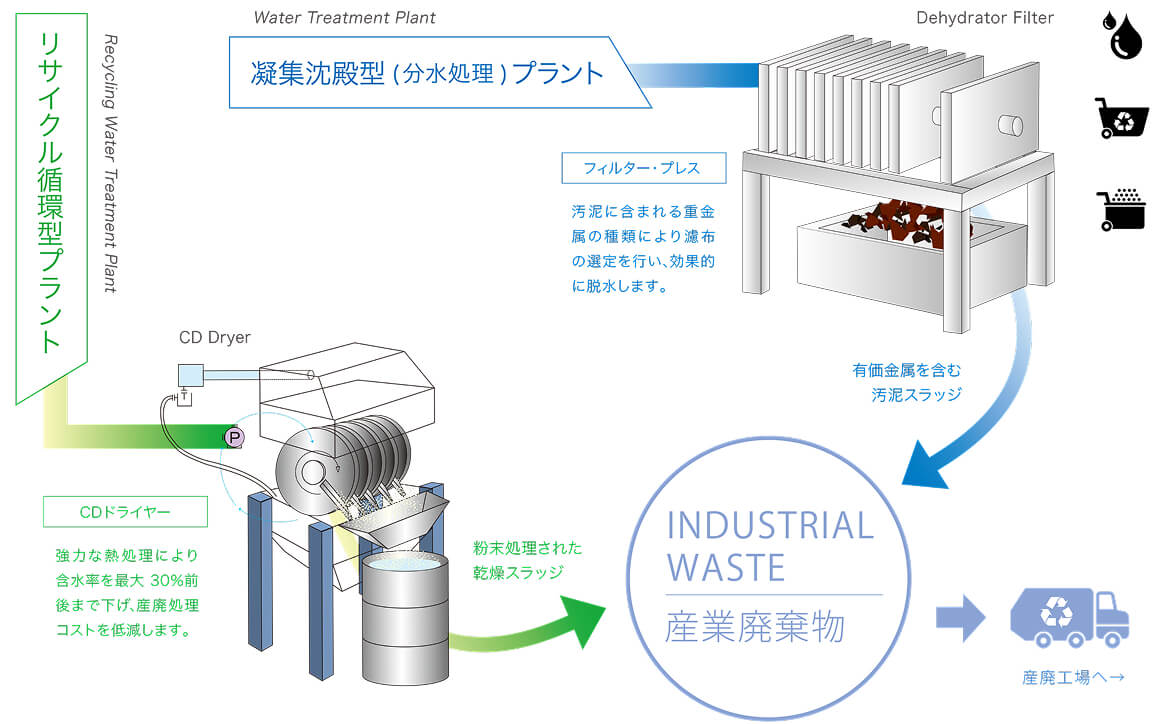 スイレイの全量脱水システムは、沈殿凝集型プラントで汚泥の含水 率を75%前後まで低減。リサイクルプラントで汚泥の含水率を30% 前後まで低減。産業廃棄物の処理コスト削減と有価金属のリサイクルを実現します。