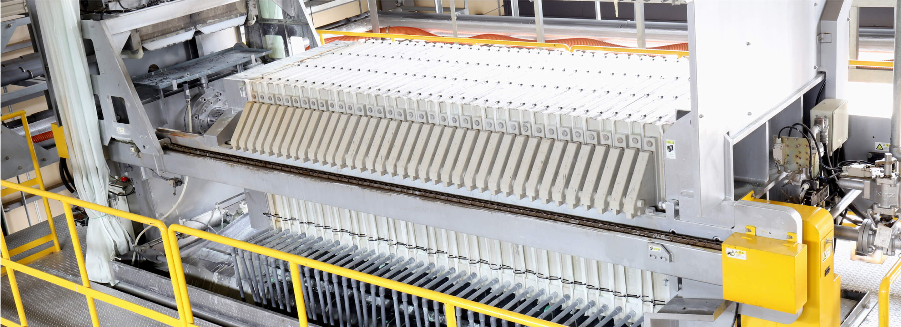 フィルタープレスは、重金属汚泥から水分を抜き、体積を大幅に低減します。汚泥の平均含水率は99%。フィルタープレスを使用すれば、75%前後まで引き下げられるため、弊社では様々な種類の汚泥の性質を分析し、フィルターの材質や織り方によって含水率が変わる濾布を選定。プレスにまつわる細かな調整を行うことで、排水に含まれる重金属を効率的に脱水します。排水の種類に応じて、ニッケルや銅などの有価金属を単独脱水する、分水処理型の脱水システムも、産廃コスト削減策として有効です。