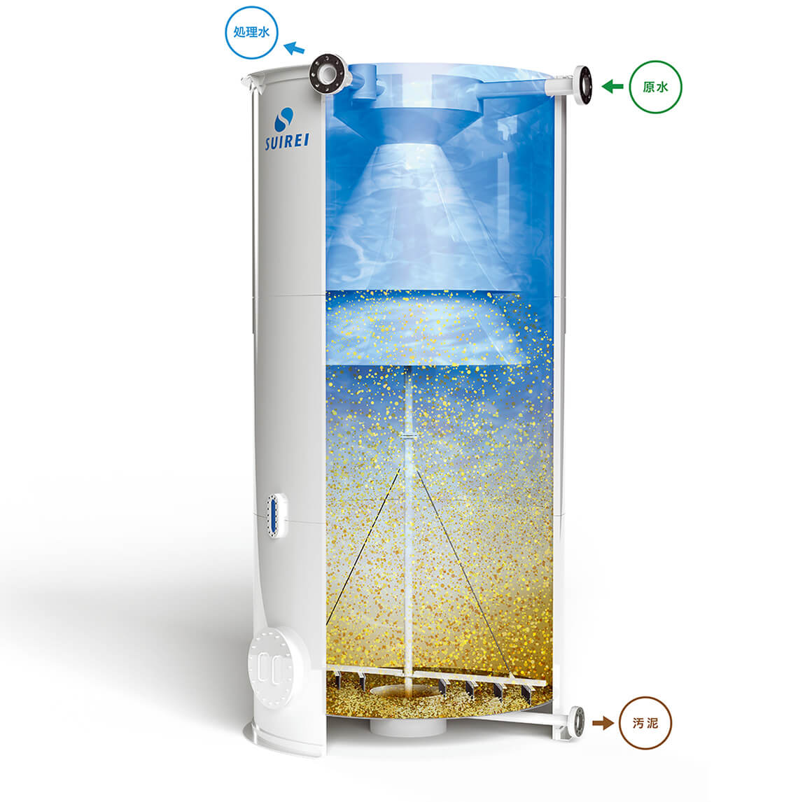 ペースが必要となります。スイレイシックでは槽内に傾斜板を⼊れることにより沈降効率を ⾼め、より短い時間、省スペースでの沈降分離が可能となりました。これにより沈降に必要 な滞留時間が削減されることで設置に必要なスペースの低減化を実現しました。