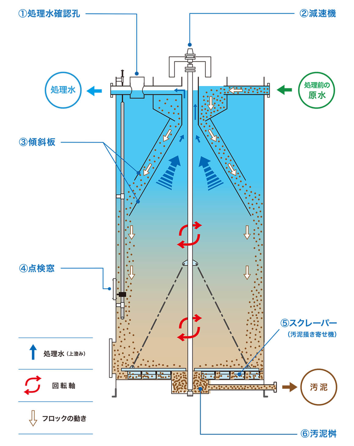 ゆっくりと回転し、傾斜板に沈降したスラッジ(汚泥)を低速で掻き寄せます。掻き寄せられたスラッジは底部に集められ汚泥桝により排出されます。
